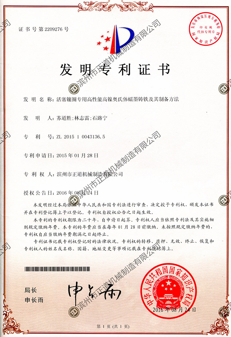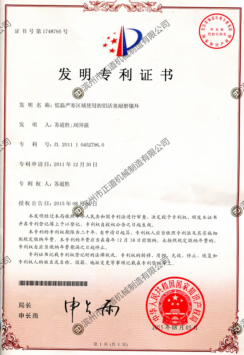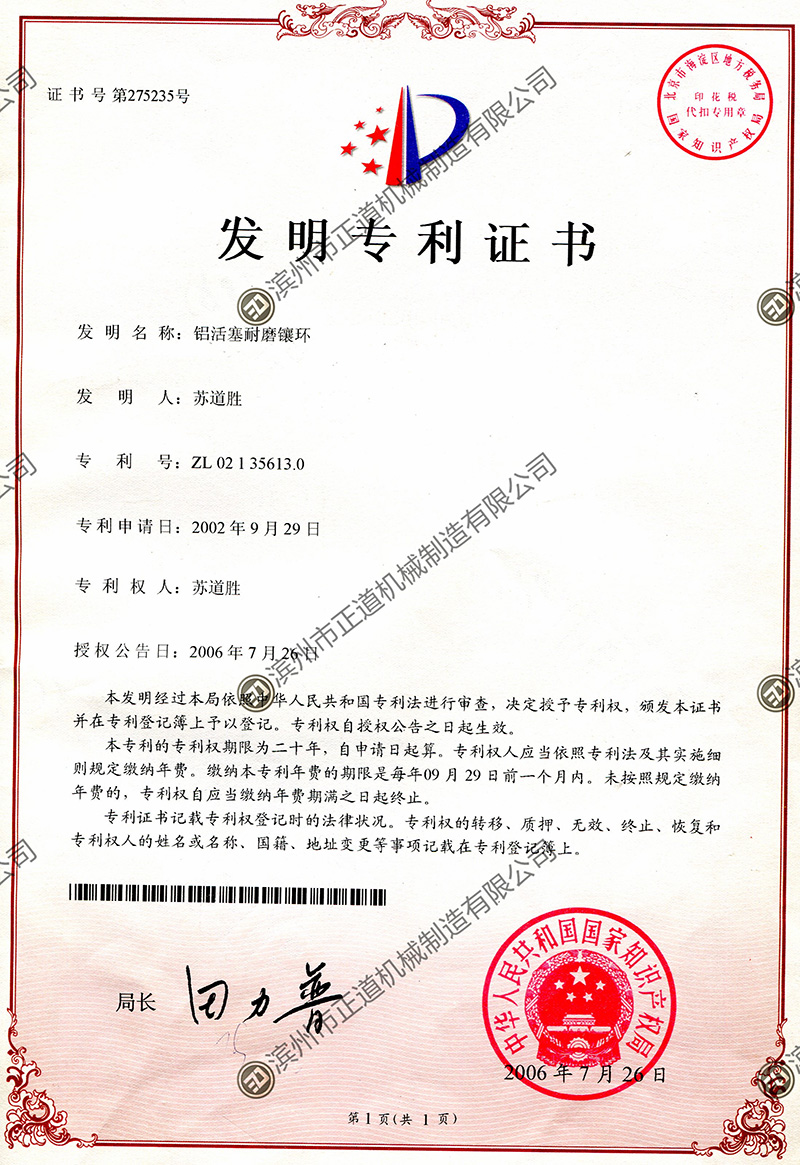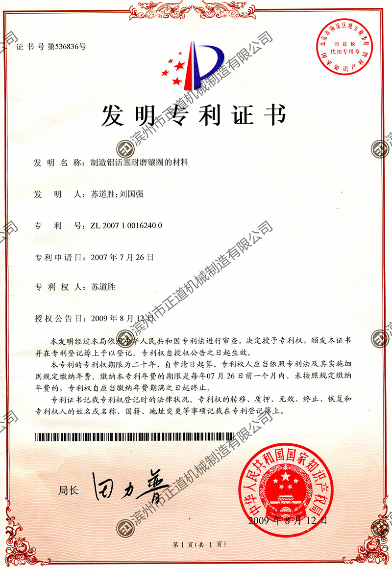 3、Mr. Su Daosheng, the Chairman of the company, is the chief research expert in China for wear-resistant liner rings of aluminum pistons. He initiated the research on liner rings in 1984 and was the first person in China to successfully develop wear-resistant liner rings. The products manufactured by Zhengdao Company are recognized as the top in technology and quality among all manufacturers in China.